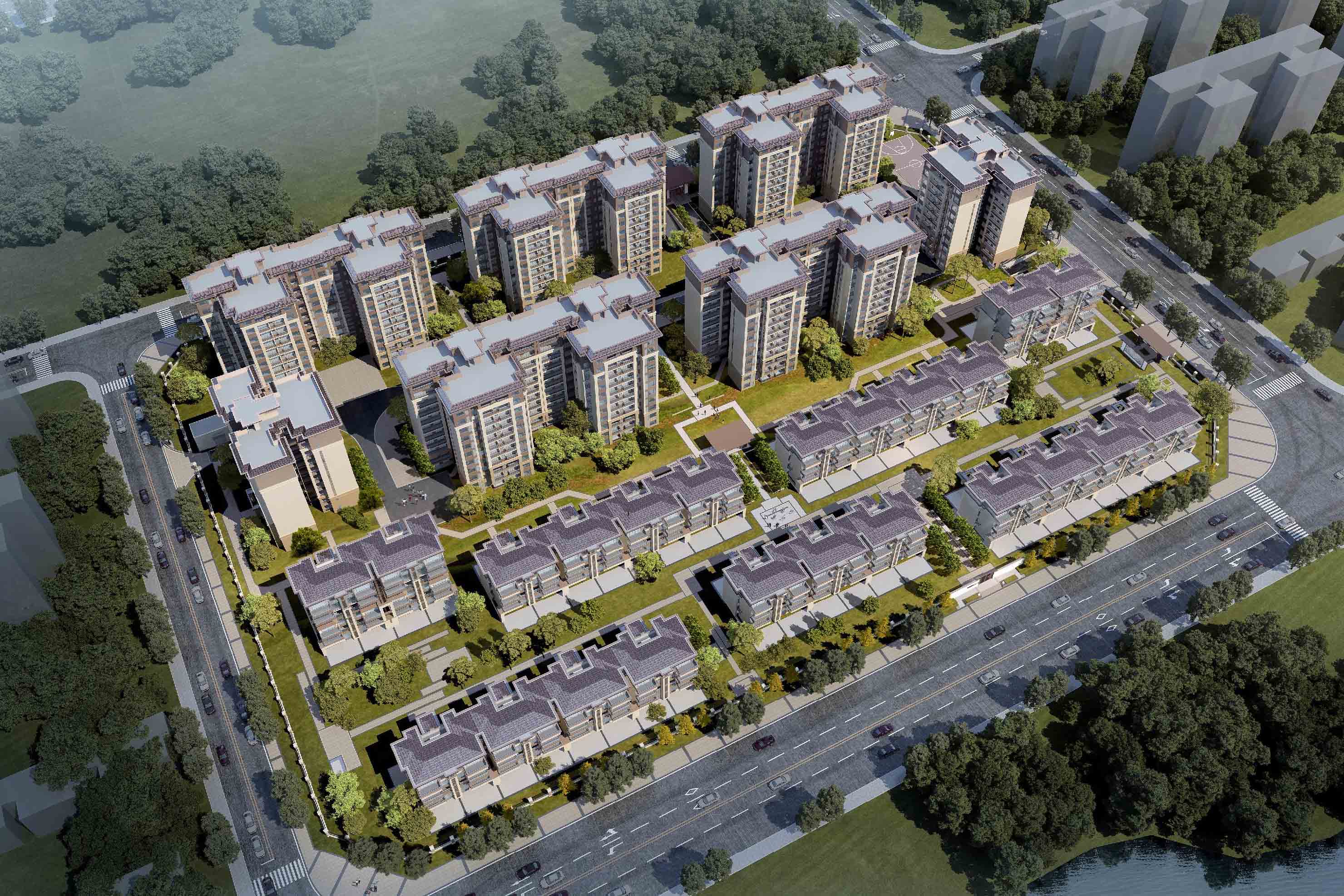 美的·金輝郡是金輝集團美的置業的合作開發項目,位于眉山市天府新區仁壽縣仁壽大道旁,項目占地約63畝,容積率僅1.50,綠地率高達40%。項目總建筑面積約9萬方,規劃有高品質的洋房和別墅產品,緊鄰2000畝城市濕地公園,整體的建筑密度僅有25%。建筑樓棟皆為南向排布,南望長平水街水景,多面通透,拉開無遮視野,兩梯四戶設置,出入靜謐,戶型設計動靜、干濕分區,通風良好,明廁、明廚一應俱全,構筑墅區洋房的質感生活意境。