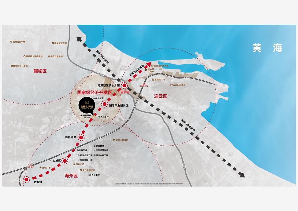 南連海州區,東接連云區,西面贛榆區,項目周邊公交2路、58路、59路、60路、901路、902路、環環相通。市郊列車,BRT路線-B20與體育中心站交匯,縱橫通達的立體交通路網,暢達全城。